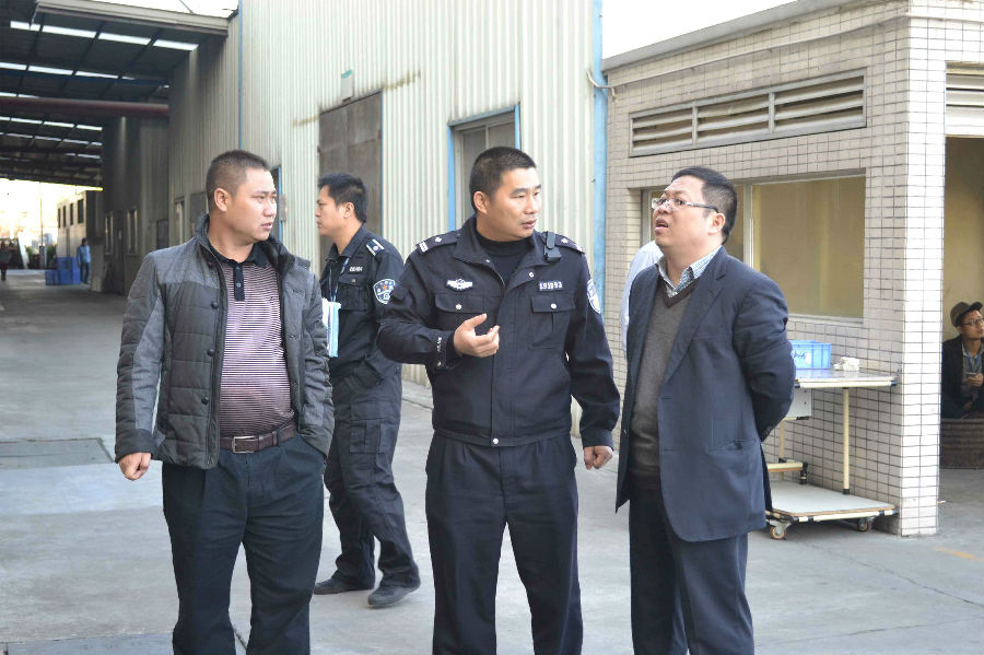 事故發(fā)生后,國(guó)家、省、市區(qū)、以及公司領(lǐng)導(dǎo)對(duì)此高度重視。在順德各鎮(zhèn)街如火如荼地全面開(kāi)展安全生產(chǎn)大檢查的同時(shí), 2015年1月14日上午,順德區(qū)容桂城東派出所鄧警長(zhǎng)一行來(lái)到順威,并代表容桂公安分局開(kāi)展消防安全檢查。廣東順威精密塑料股份有限公司(以下簡(jiǎn)稱(chēng)“順威股份”)綜合管理中心總監(jiān)陳詠先生,順威股份順德塑料分公司總經(jīng)理景新兵先生,順德塑料分公司生產(chǎn)部副部長(zhǎng)佘琴琴女士等公司領(lǐng)導(dǎo)陪同檢查。